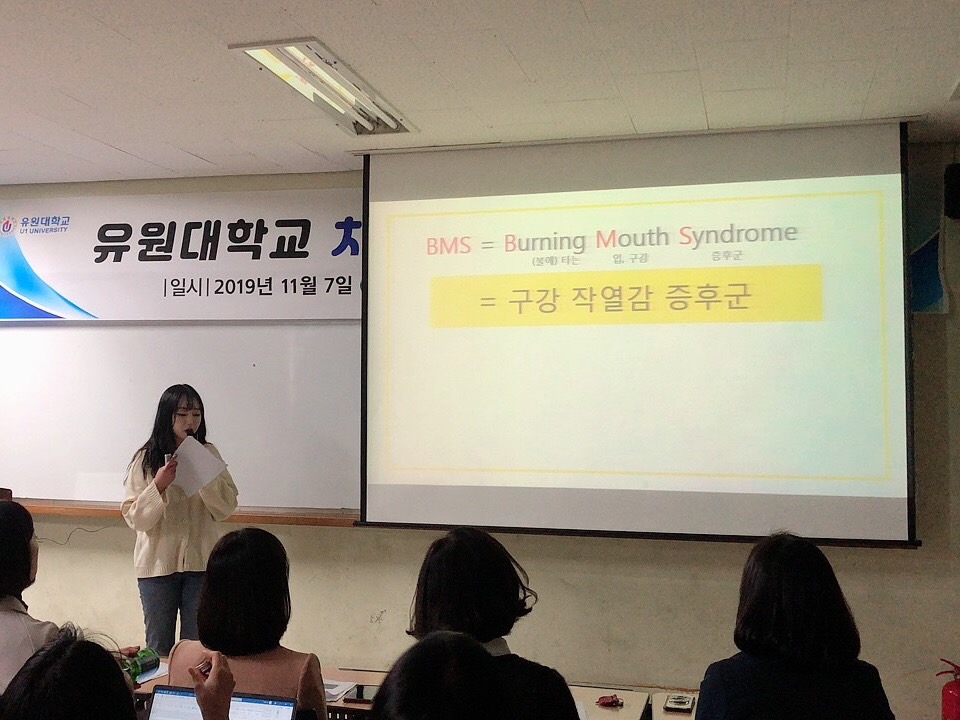 지난 11월 2일(토) 3,4학년 학생들은 ‘2019 한국치위생학회 종합학술대회'에 참석 하였습니다. 우리학교는 이번 학술대회 학생 포스터 경진대회에 4학년 5개 팀이 참여하여 ‘장애인 구강보건교육 자료에 대한 실태조사’라는 주제로 '김주희, 김희연, 정예연, 지도현'(지도교수 유자혜) 팀이 대상을 수상하였으며, 이외에도 '이혜진, 연혜선, 채승희(지도교수 이민영)', '박지현, 이우정, 전수진'(지도교수 김정희) 팀이 장려상을 수상하는 좋은 결과를 얻었습니다. 이에 대상을 수상한 우리학교는 학생 포스터 경진대회에 참여한 전국의 치위생학과 약 40여개팀을 대표하여 구연발표를 하였습니다. 우리학교 치위생학과가 앞으로도 꾸준히 치위생학 발전에 기여하며 학교를 빛내기를 바랍니다^^